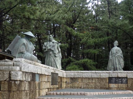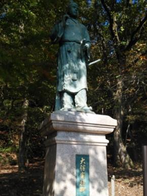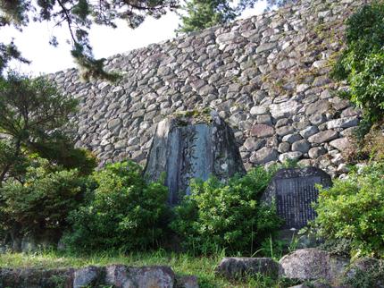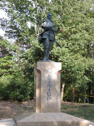 本丸址に明智光秀の銅像、家紋のキキョウの花
