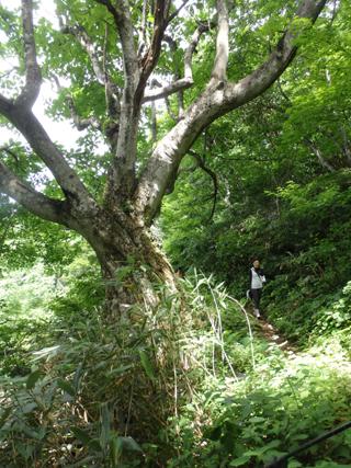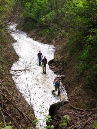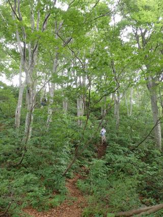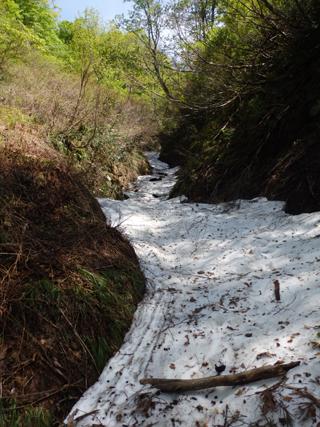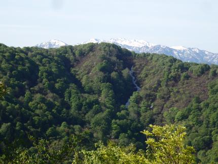 新緑に覆われた山、谷コースは雪に埋まり遠く残雪の白山