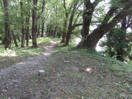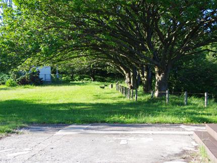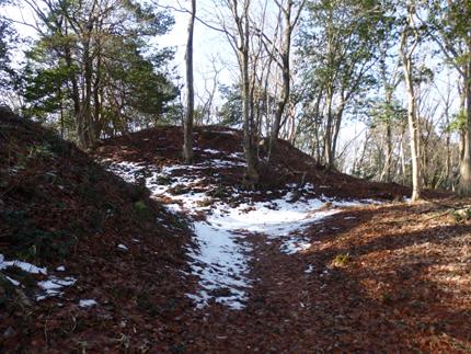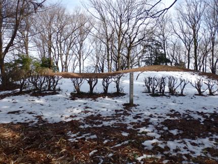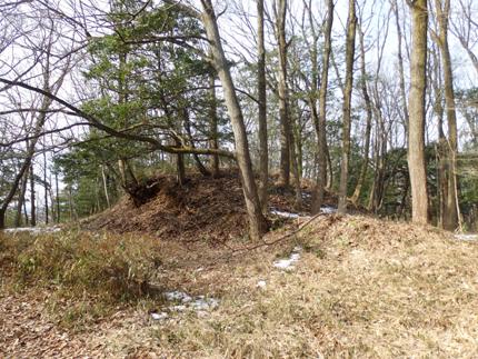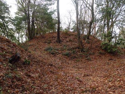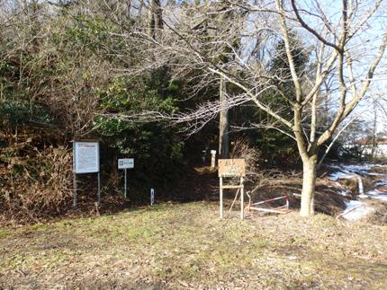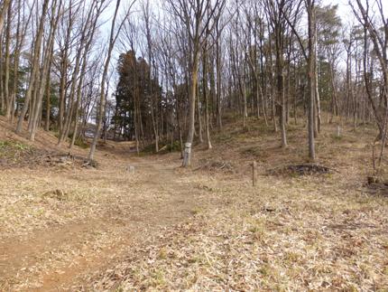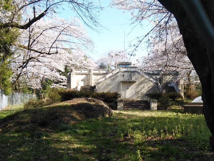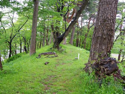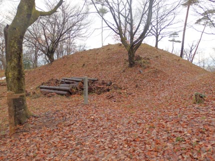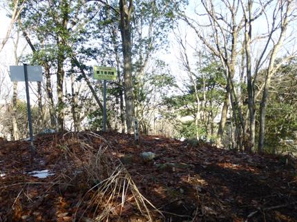 石垣の無い城、土塁の上に三角点、今は葉桜